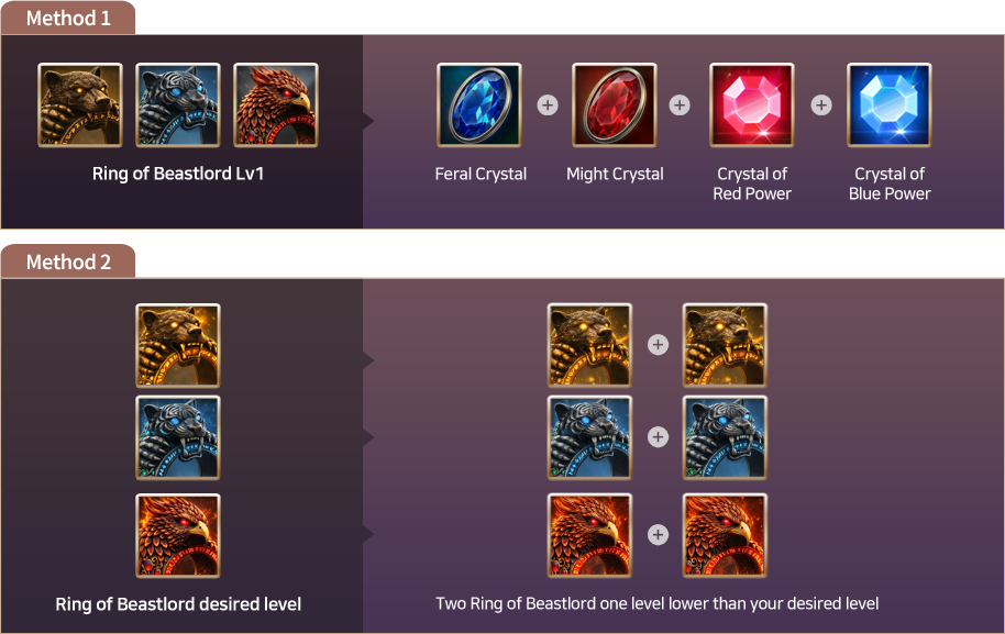 Ex) Ring of the Warlord Bear Lv6 requires two Ring of the Warlord Bear Lv5.